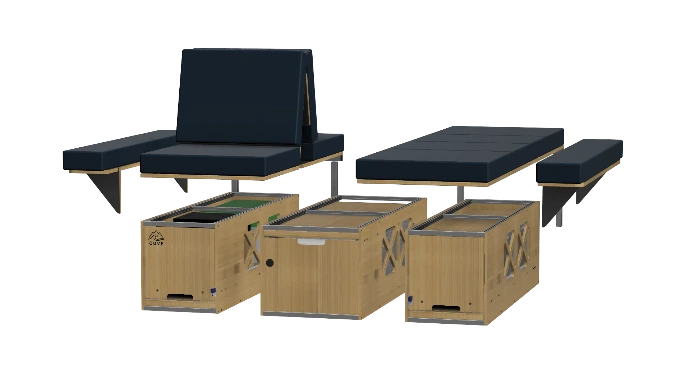 Je kunt de modules namelijk onafhankelijk van elkaar gebruiken. Ga je op vakantie of een weekendje met z’n tweetjes naar een festival, dan heb je alle modules nodig. Maar wil je daarna alleen op pad voor een sportief uitje, dan laat je een ladedeel en een beddeel thuis. Zo heb je ruimte voor je mountainbike of surfboard. Ben je even niet op reis, dan zet je alle modules op je logeerkamer als logeerbed