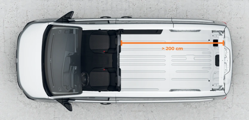 Trek de rolmaat vanaf de achterdeuren strak over de vloer naar voren, helemaal tot aan de voorstoelen of het tussenschot. Je hebt in de lengte minimaal 2 meter (200 cm) nodig.